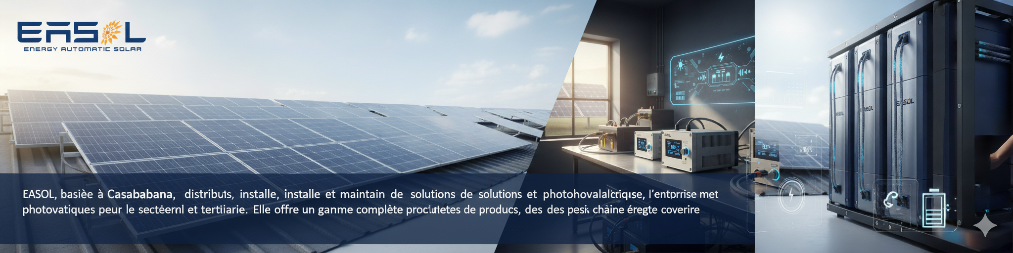 EASOL est une société spécialisée dans la distribution de matériel électrique et de solutions photovoltaïques destinées aux installations solaires résidentielles, industrielles et tertiaires. Basée à Casablanca, l’entreprise met à disposition de ses clients une large gamme de produits de haute qualité couvrant l’ensemble de la chaîne énergétique solaire — du panneau photovoltaïque jusqu’aux systèmes de stockage et d’alimentation électrique.